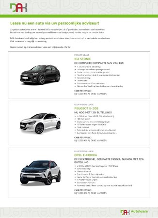 Of het Private Lease, Zakelijke Lease, Financial Lease of Shortlease betreft, Hypotake4you kan voor jou alles op een rijtje zetten en helpen de juiste keuze te maken. Ook kun je een offerte aanvragen of direct een bestelling plaatsen. We bieden altijd scherpe deals in combinatie met een goed uitrustingsniveau en goede leasevoorwaarden, op een breed gesorteerd aanbod. Ook kunnen in een handomdraai de totale autokosten van je huidige auto inzichtelijk gemaakt worden, en worden vergeleken met wat je voor een dergelijk bedrag zou kunnen leasen.